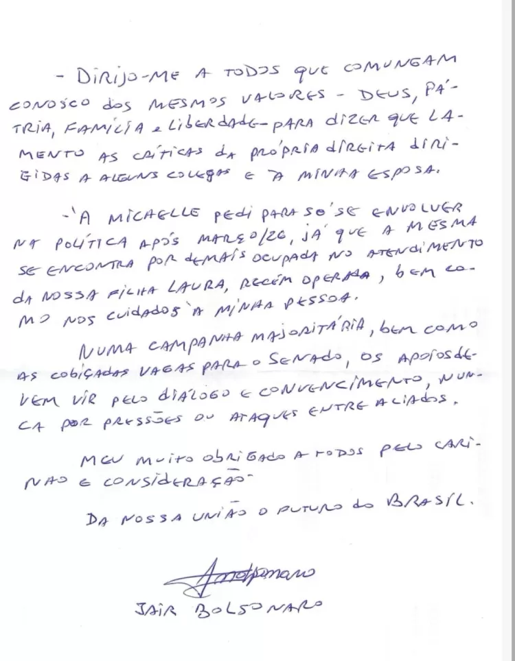 Confira abaixo a carta de Jair Bolsonaro para Michelle: